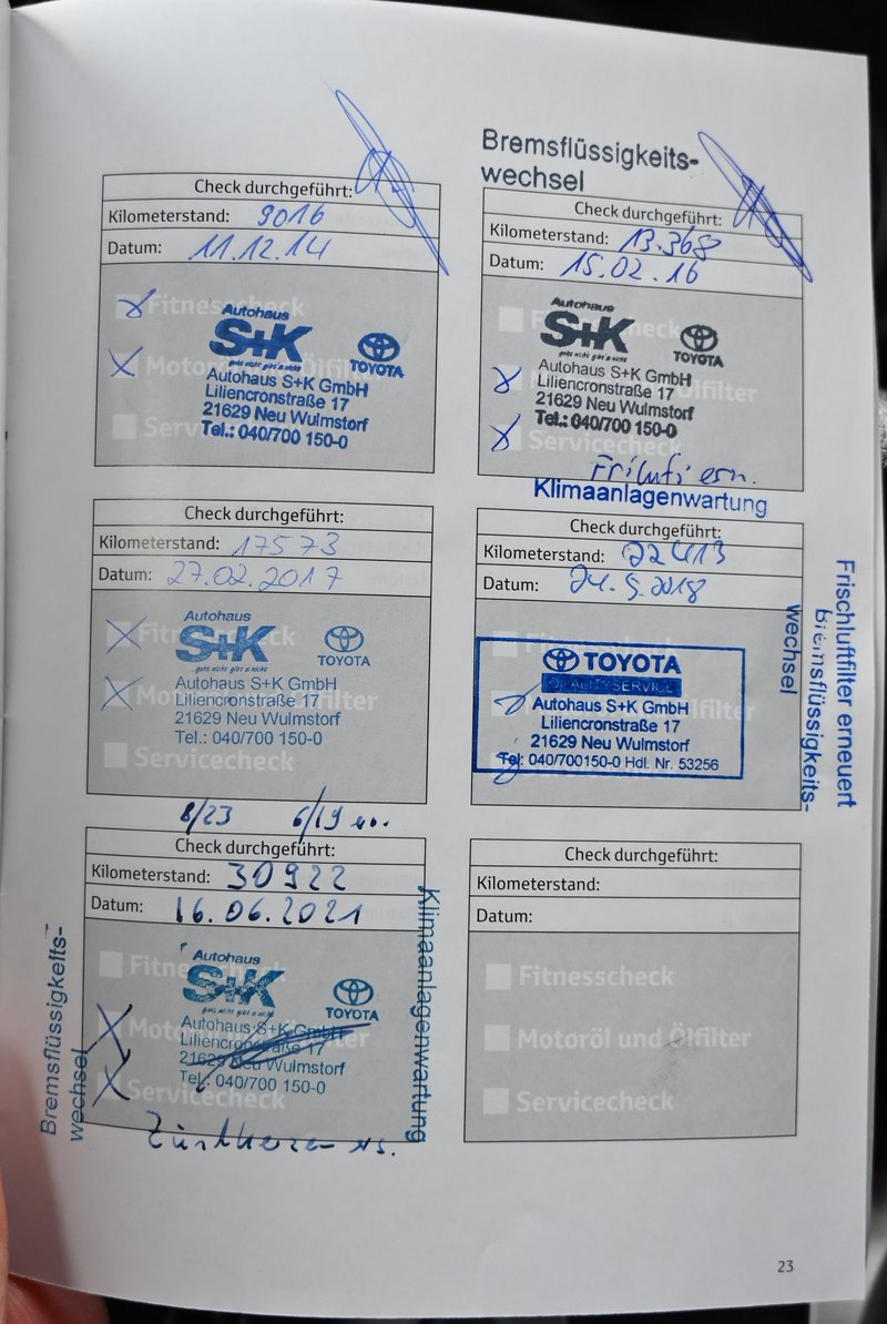 - "Scheckheftgepflegt bei Toyota bis 2021, danach wurden Wartungen und Inspektion Privat durchgeführt."